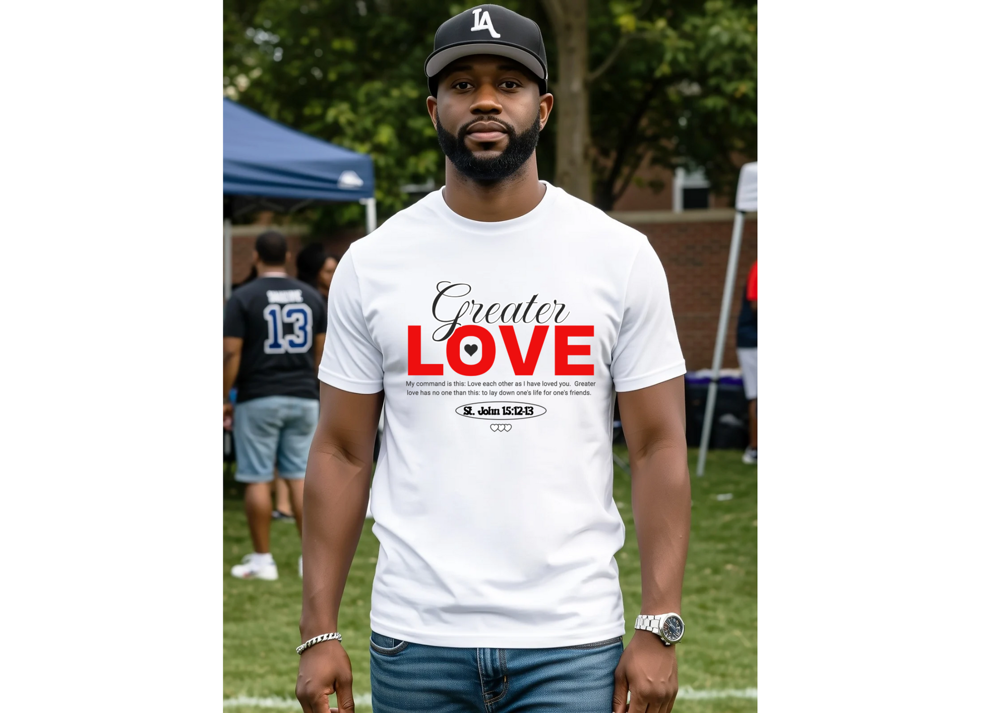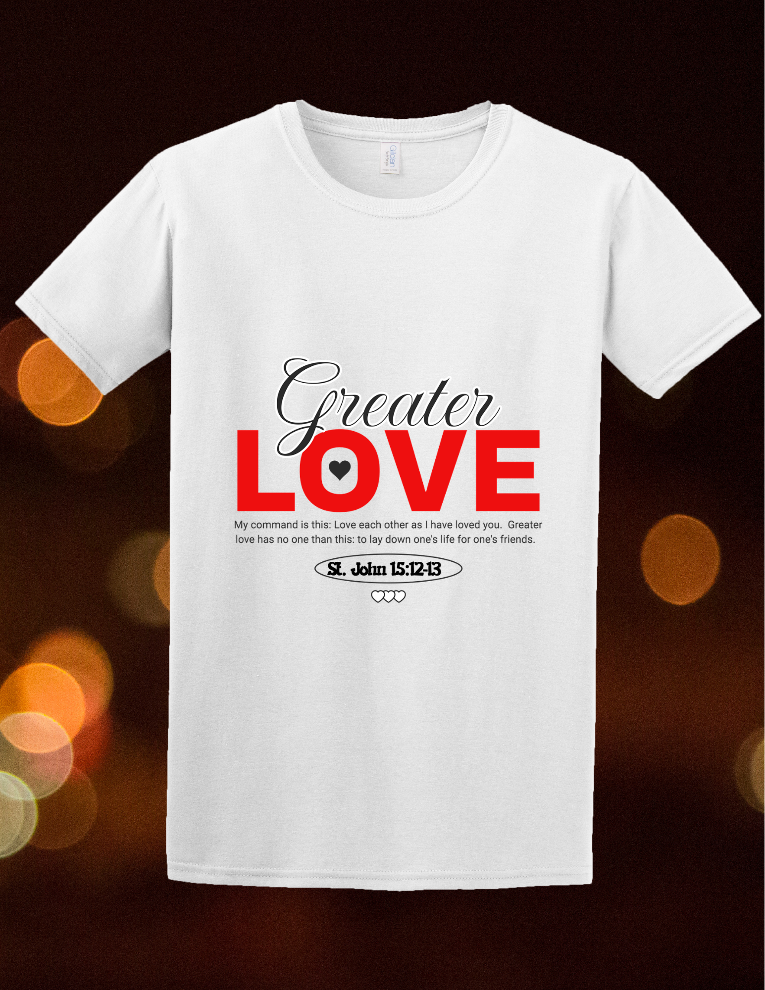 Straight from the mouth of Jesus: "Love one anther as I loved you...no greater love than to lay down one's life for a friend." Designed bold letters, this tee is the ultimate love statement loyal, sacrificial, real. Big Love. Realer than real.